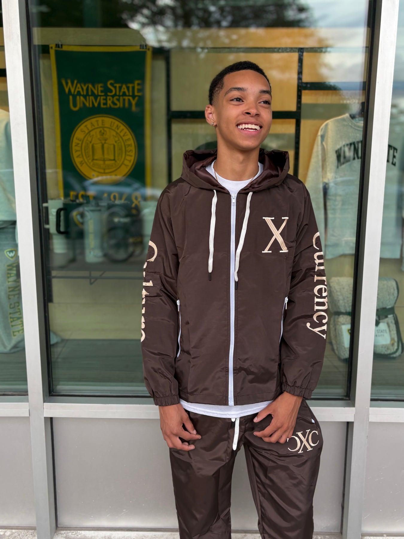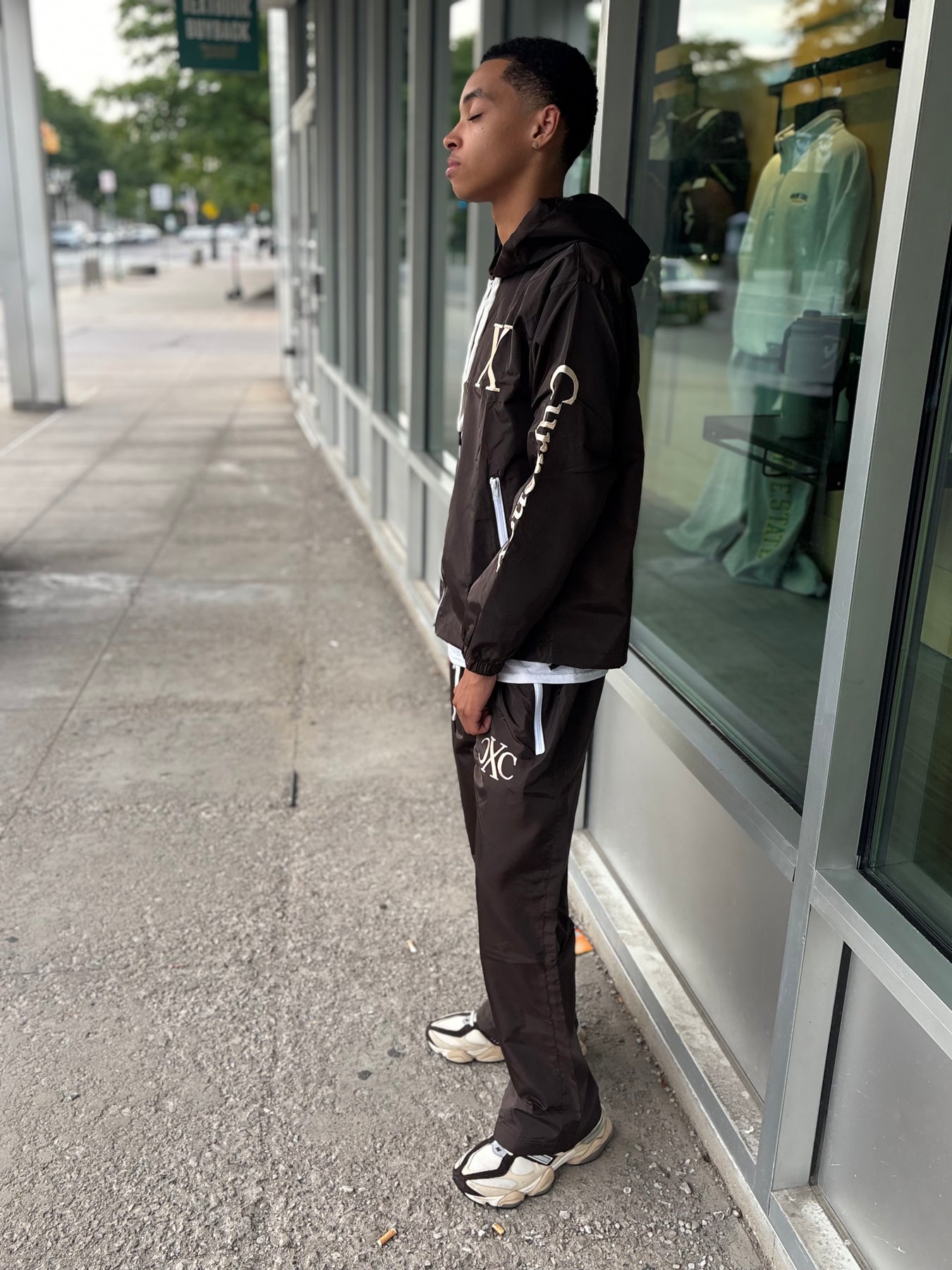 This lightweight, water-resistant set is designed in a rich brown finish with tan embroidery, blending bold streetwear with premium details: